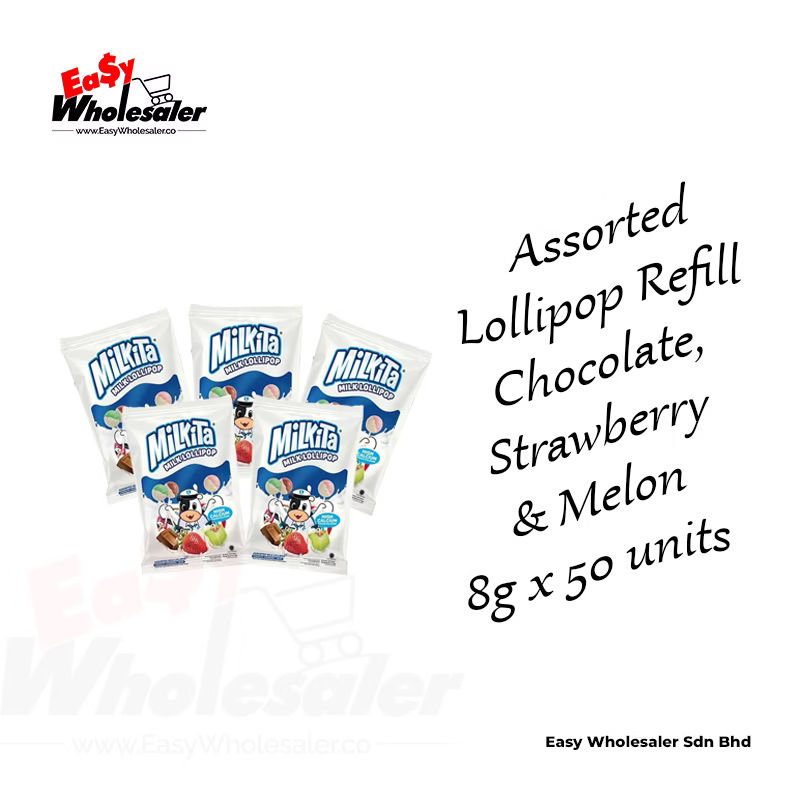 Milkita Assorted Lollipop Refill Chocolate, Strawberry and Melon 8g offers a delightful trio of tastes in a convenient pack. This refill pack is perfect for satisfying sweet cravings and sharing with friends and family. The lollipops come in bright, appealing colors and have a smooth texture, making them enjoyable for all ages. Ideal for on-the-go snacking, party favors, or casual get-togethers, these lollipops provide a mix of rich, sweet, and refreshing flavors that cater to different taste preferences. Compact and portable, they are easy to carry in your pocket, bag, or lunchbox. 🍫🍓🍈🍭