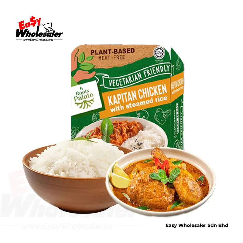 Roots Palate Vegetarian Kapitan Chicken With Steamed Rice 300g offers a modern twist on the traditional Kapitan Chicken. This plant-based meal features savory vegetarian chicken paired with fragrant steamed rice, creating a convenient and delicious dining experience. Crafted from high-quality plant-based ingredients, the Kapitan Chicken mimics the taste and texture of the original dish. The rich Kapitan sauce, made with aromatic spices and herbs, delivers robust flavors. Packaged in a generous 300g portion, it’s ready-to-eat and ideal for busy lifestyles. Whether you’re a vegetarian or simply seeking a flavorful meal, this option provides a balanced combination of carbohydrates, protein, and essential nutrients. Enjoy it by heating and serving, pairing with sides, or adding garnishes for extra flavor! 🌱🍛🍚